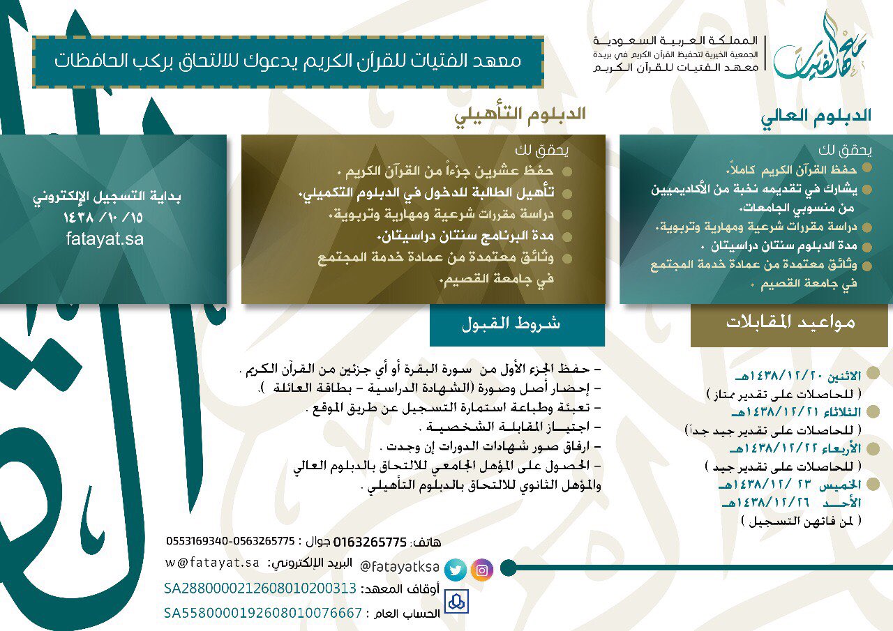معهد الفتيات للقرآن الكريم Di Twitter إعلان معهد الفتيات للقرآن الكريم بريدة يدعوك للإلتحاق بركب الحافظات لكتاب الله ونيل الخيريةالموعودة خيركم من تعلم القرآن وعلمه القصيم Https T Co Suskgj6dnr