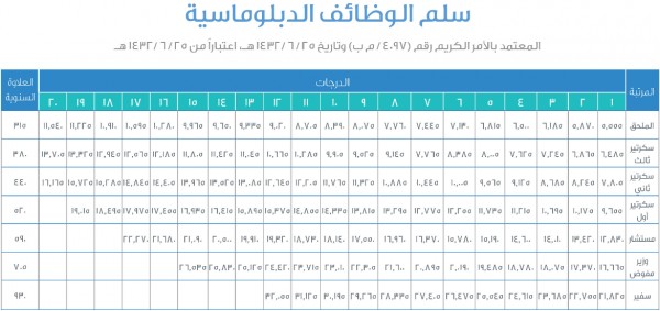 سلم رواتب الوظائف الدبلوماسية حسب الأمر الملكي 25 6 1432 هـ المصدر السعودي
